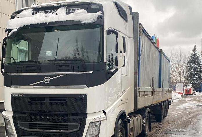 На фото можно видеть бортовой полуприцеп нашей компании, способный одновременно перевозить две стандартные 6-метровые бытовки.