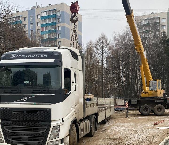 Погрузка и перевозка дорожных плит бортовым полуприцепом и автокраном