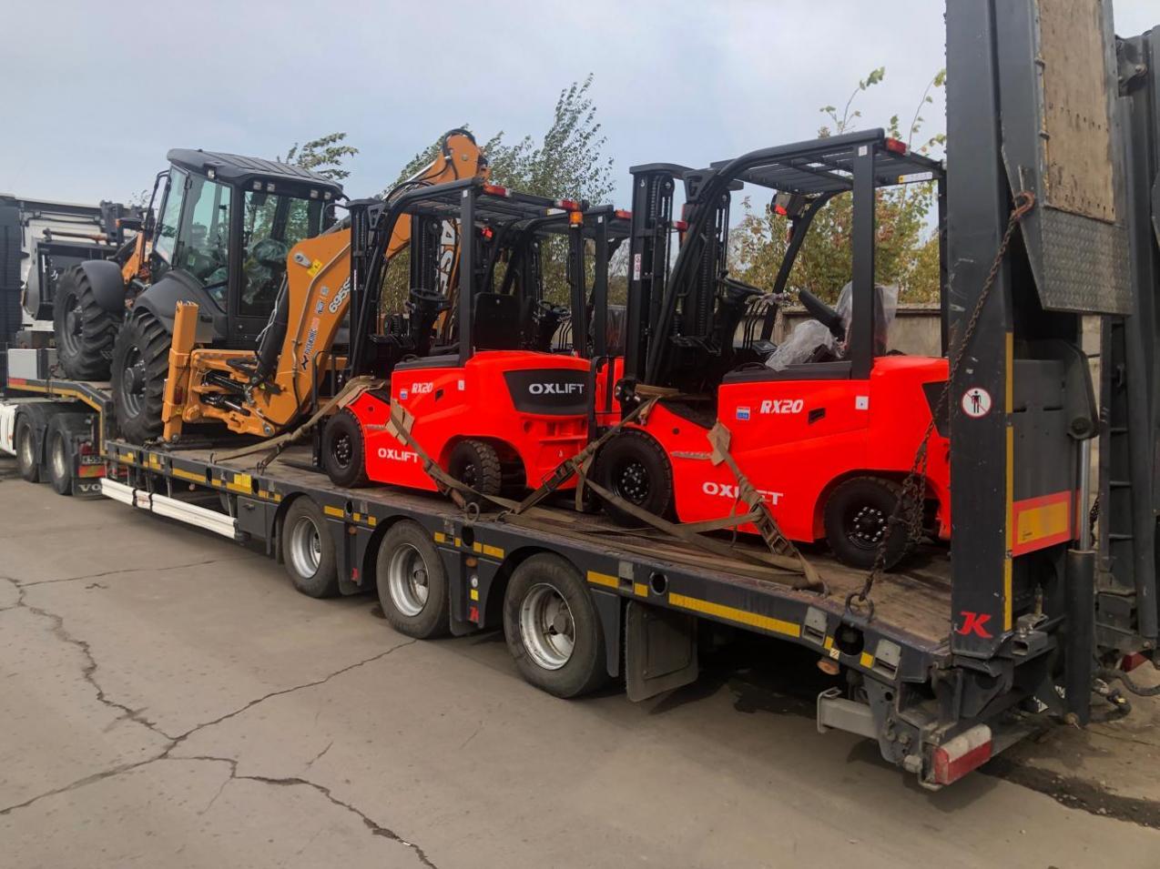 Перевозка экскаватора погрузчика JCB 3CX и двух вилочных погрузчиков низкорамным тралом с аппарелями