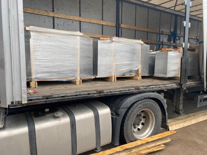 Погрузка изделий из камня в обрешетке с боковой растентовкой фуры