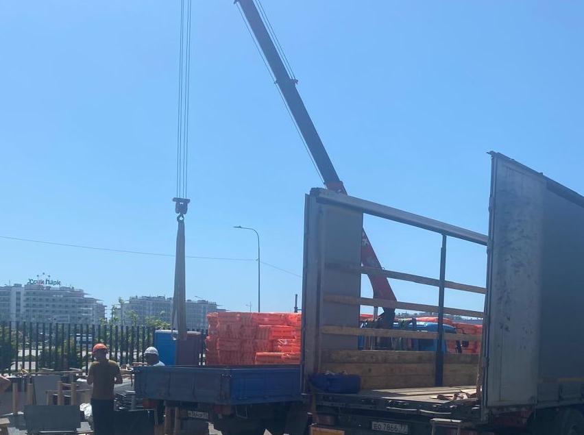 Автокран производит погрузку бортового полуприцепа строительными бетонными блоками для их перевозки