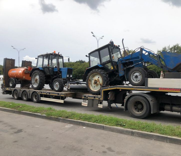 Низкорамный трал с аппарелями перевозит коммунальные трактора МТЗ