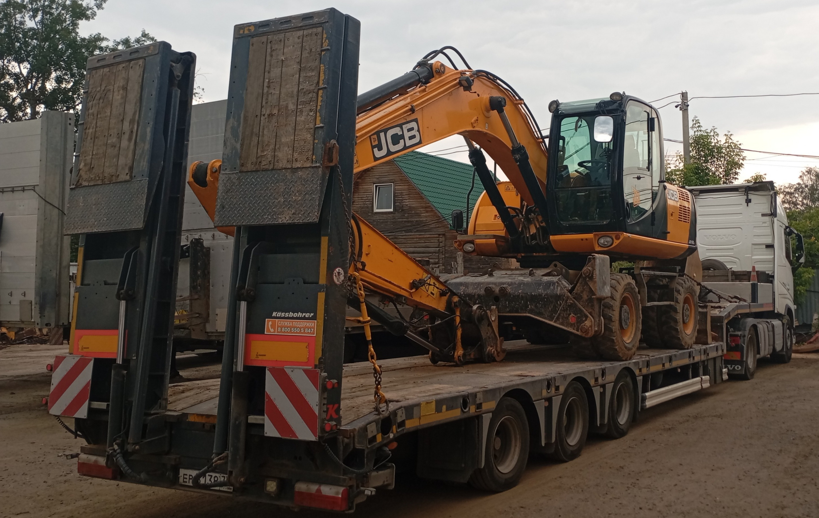 Низкорамный трал перевозит полноповоротный колесный экскаватор JCB JS 160 W
